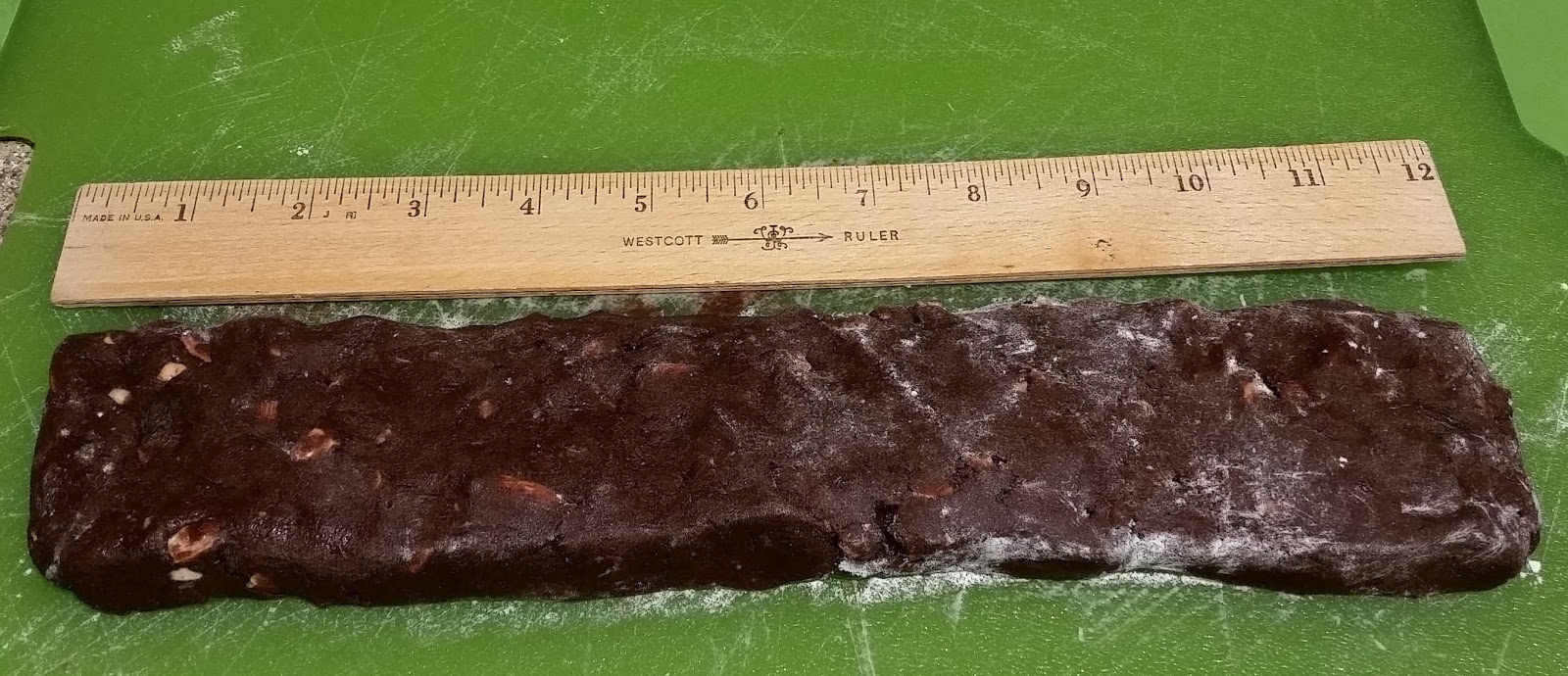 Working with one at a time, use a large spatula to loosen the dough from the cutting board.  Lift one end and pick up the log and place approximately 2 inches from the side of the cookie sheet.  Place the second log on the other half of the cookie sheet.
